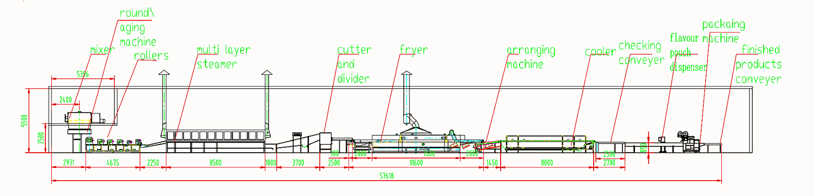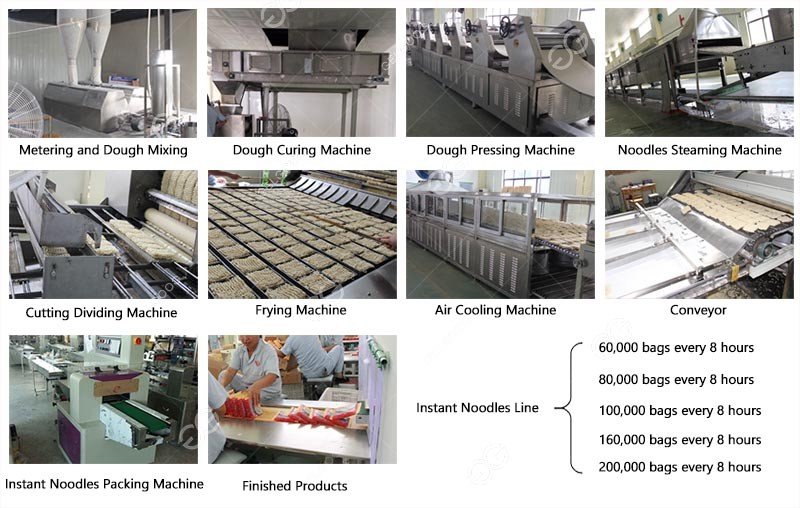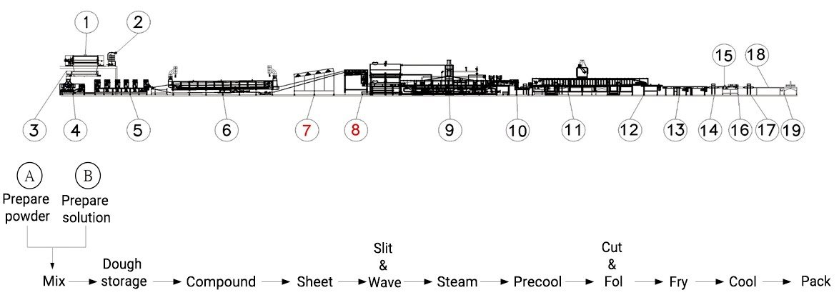 Flour Sieving 🡪 Flour Air Convey 🡪 Double-Shaft Mixing 🡪 Dough Ripen 🡪 Compound Rolling 🡪  Continuous Rolling 🡪  Slitting And Forming 🡪 Continuous Steaming 🡪 Cutting And Folding 🡪 Oil Frying 🡪 Arranging 🡪 Cooling 🡪 Distribution –🡪 Packing And Conveying 🡪 Packaging