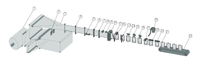 Flow :-  Film Unwind 🡪 Bottom Hole Punching 🡪 Bag Forming 🡪 Film Guide 5 Bottom Seal 🡪 Vertical Seal 🡪 Vertical Seal 🡪 Photocell  🡪  Servo Advance 🡪 Cutting 🡪 Pouch Catching 🡪 Pouch Catching II 🡪 Slant Opening Cutting 🡪 First Pouch Opening 🡪 Vibrator 🡪 Spout Inserting 🡪 Spout Seal 🡪 Second Pouch Opening 🡪 Air Flushing 🡪 Filling I 🡪 Filling II 🡪 Pouch Stretching 🡪 Top Seal I 🡪 Top Seal II 🡪 Finished Product Outlet